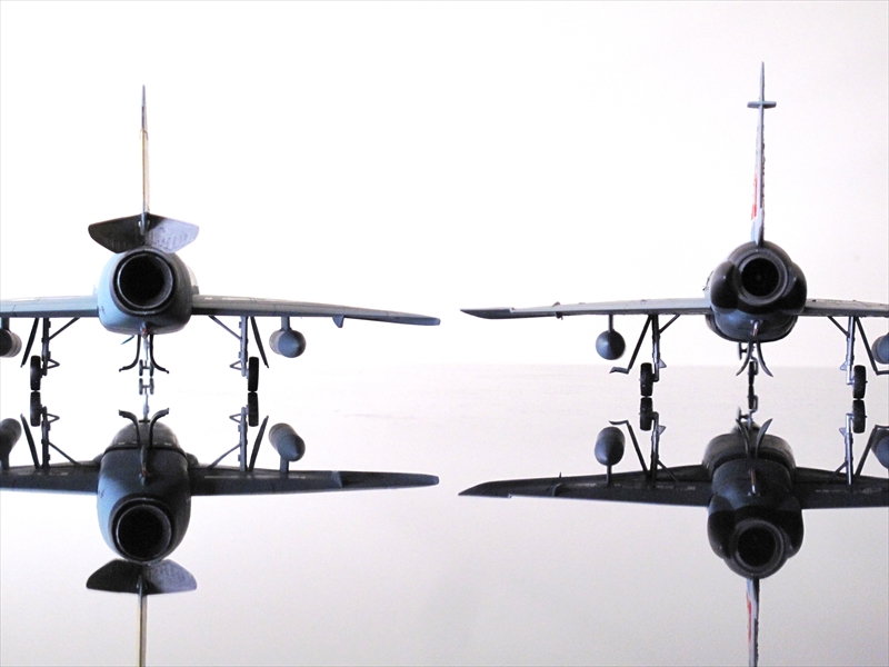 ジェット機のプラモ共通の課題として薄い主翼の(場合によっては胴体も)モールド部品自体が捩じれていることが多く、翼の取り付けは正面図とニラメッコが必須です。また、デルタ翼機は離着陸時の失速特性の調整のために前端や後端に捩じり下げを施していますが、完成した両機を後方から見るとちゃんと主翼の捩じり下げが表現されています。
