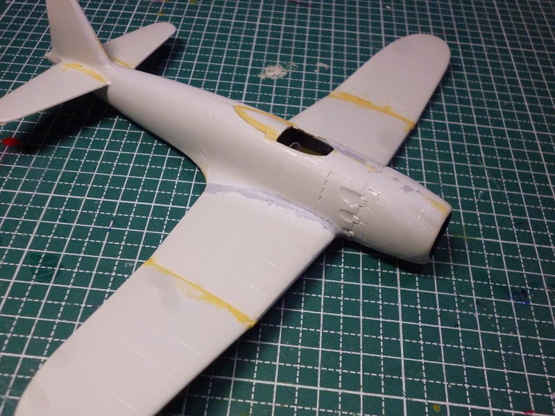 MPMはチェコのメーカーだが、はるか東洋の日本機を積極的に製品化してくれている。初期製品のこととて、主翼の外翼はムク、しかも中央翼との接着のために、ホゾもピン穴もない。イモづけでは強度が足りないし、烈風の美しい二段上半角の再現は不可能だ。金属のピンを埋め込み接着、継ぎ目と隙間はタミヤのエポキシ・パテで埋めた。ソリッド感覚で対処、めげずに組立てを完了したのち塗装をする。