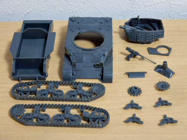 部品点数は51で,そのうち1/3ぐらいは,再現する車体によって不必要になるものです。また,一見大口径の砲身に見えるものは,実は,75mm榴弾砲のおおいでその中に砲身が入っています。本当の砲身の部品は無いのでジャンクからそれらしい砲身を用立ててやらねばなりません。