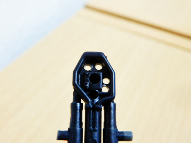 抜けていないところは,小径ドリルでいくつか穴を開けた後,くりぬいて整形しました。実は,取っ手の後ろ半分は,本当は,棒状になっている(でないと砲弾を装填できない)のですが,今回は修正を見送りました。気になる方は,タミヤのキットを作ればよいだけのことです。また,砲尾に肉抜き穴が2つありますが,これがなんと,完成後,見える側にあいているではないですか・・・怒!・・・。ここも,整形が必須です。