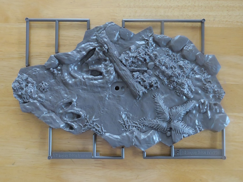台座はキットのモールドのままで、とくに手は加えず、塗装しただけです。ところどころタミヤの情景テクスチャーペイント(草 カーキ)と(草 グリーン)を塗っています。なお、「草(草本性植物)」は白亜紀後期に誕生したということですので、トリケラトプスのいた時代には草が生えていたということになります。ということは中生代のかなりの時期は草が生えていなかったので、また草ばかりでなく木の実・果実・根なども食べたものがいたようなので、「草食恐竜」ではなく「植物食恐竜」ということが多くなりました。