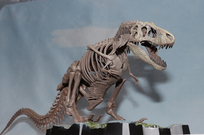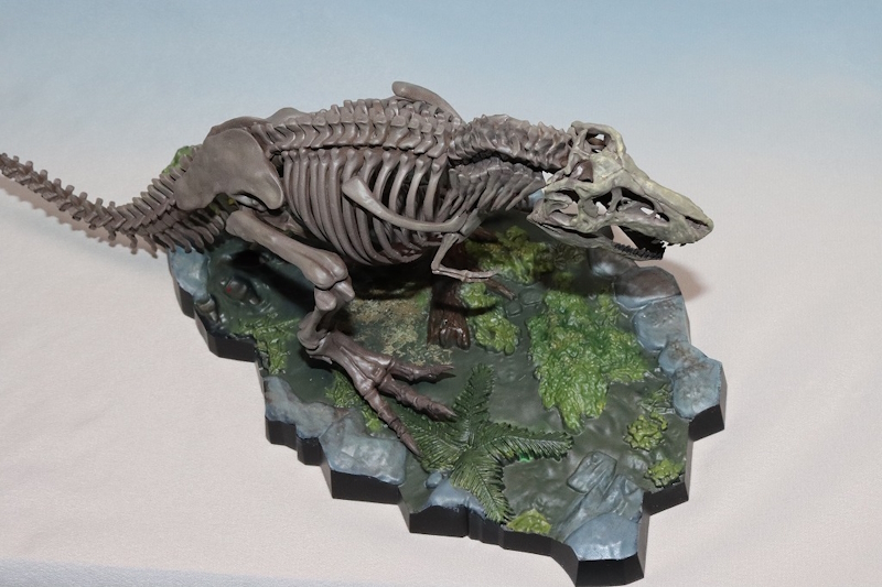このキットでは透明なスタンドを使って、ティラノサウルスが獲物に跳びかかる姿を再現できるようになっていますが、6~9トンと推測されている巨体でそんなことができたのか疑問なので、台座と腰椎内側に開けてあるスタンド用の穴を埋め、台座に直接立たせるようにしました。ただ、足指の形状はそのままにしています。