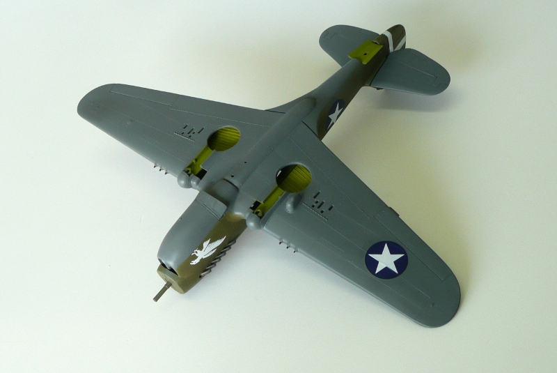 機体の塗装色は、前述のように上面がオリーブドラブ、下面がニュートラルグレイです。まだ水平尾翼が付いていませんがラダーに付ける白色のマークを塗装するため、水平尾翼は塗装後取り付けることにしました。デカールはマイクロスケールのものを使用しましたが、やはり古いためマイクロスケールのデカール・リキッド・フィルムで補強した後、軟化剤を使って貼り付けました。水平尾翼を取り付け、デカールを貼り終えた状態の機体上面が(写真12)、下面が(写真13)です。