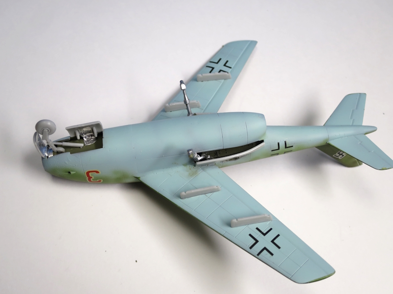 第2次大戦期のドイツのジェット計画機ですが、SFの世界のジェット機といってもよい存在なので、翼下には しっかりと誘導ミサイルを搭載してみました。レドーム色のミサイルがレーダーホーミングタイプの設定であります。(もちろんあちらの世界の空想設定です。)