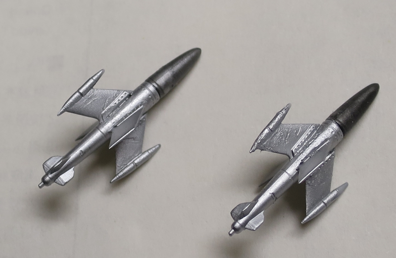先端 黒鉄色のミサイル2発は打ちっぱなしタイプで、箱絵の米陸軍仮想4発想爆機を足止めしておいて、後方からレーダーホーミングミサイルで確実に仕留めるという構想です。