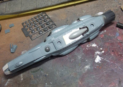 (写真4) 艦橋レスの船体なので、開口部をプラ板で塞いでテキトーなジャンクパーツで埋め合わせ。お腹の下のバルジに付けたドロップタンクの片割れもついでにぺたり。無人艦って設定なので居住区画をオミット出来るから、同じ能力でも全体的に小型化が可能って訳ですよ(転じてブリッジ要らない)。一番砲塔も全体的なバランスから撤去しております。押し出し感よりも端正さ重視、ってことで。