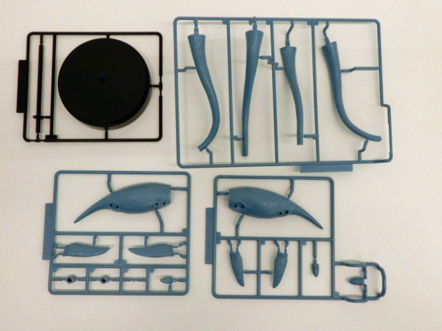 接着剤不要のスナップフィットキットで,ポーズ変更用の差し替えパーツ(伸ばした首と曲げた首,閉じた顎と開いた顎)にジョイント用の2パーツ,スタンド用の2パーツがついて合計18パーツで構成されています。また,体表の部分にゲート跡が残らないようにアンダーゲートが多用されています。
