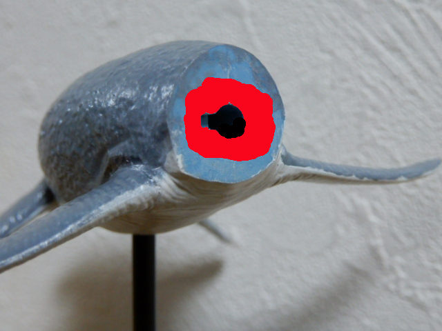 首と胴体は,ほぼ隙間無く接続できるので差し替え式にしました。うまく調整すると,真横から見ない限り隙間は見えません。調整は,接続部の断面をやすりスティックで削ることで行いますが,やり過ぎるとかえって隙間を広げたり首と胴体の間に段差ができてしまうのでほどほどのところで妥協するか,いっそ差し替えを諦めて接着するか,どちらかをおすすめします。 (赤く塗ったところを中心に削って調整します。縁を削ると段差ができるので注意。)
