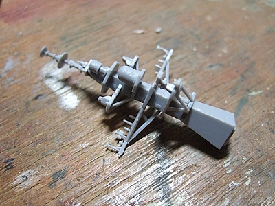 (写真2) 艦橋マストも素のままのパーツを組んだだけ。細部まで結構イイ出来であります。これ以上細かかったら見えないからこの程度で充分。エッチングは不要だね。見えないパーツは要らないパーツなのであります。
