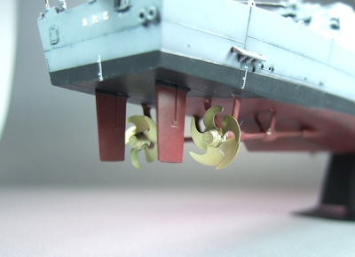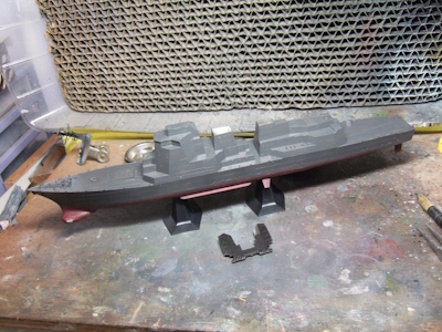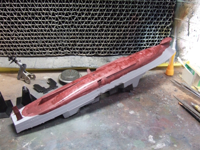(写真3) この辺りから制作再開した途中経過写真ですね。取敢えずラダーやスタブフィンくっつけて筆塗りで艦底色をだーっと塗っとく。デカいから塗りでがあるのう。