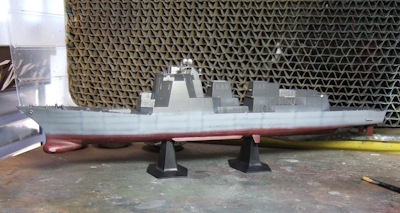 (写真5) 舷側を指定色より一階層明るいグレーで塗ってまいりま~す。下地に暗い色塗ってるから明るめにしないと暗くなりすぎちゃうのよ。端から指定色塗るとベタ塗りになっちゃうし、この方が明度のコントロールもし易いしね。