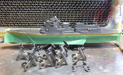 (写真6) 舷側塗ったら取敢えずマスキングして、小物パーツをチマチマくっつけてまいります。船はこの時間が一番長いよなぁ~。ヒコーキだったら足回りくらいなんで耐えられるけれど、船のチマチマ攻撃はモデラーの忍耐力を試されているような気がする。一日で使える集中力には限りがあるし(若い頃には考えられなかった)、艦船モデラーはスゲーなぁと思う一時であります。