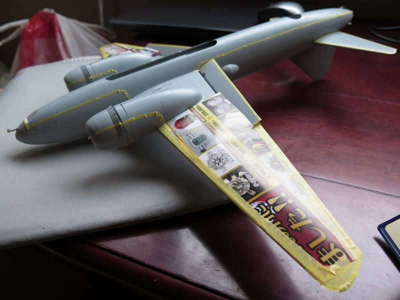 機体の塗り分けは、細く切ったマスキングテープで境界面を形成し、翼面等広い部分はチラシも利用して覆った上でスプレーしました。