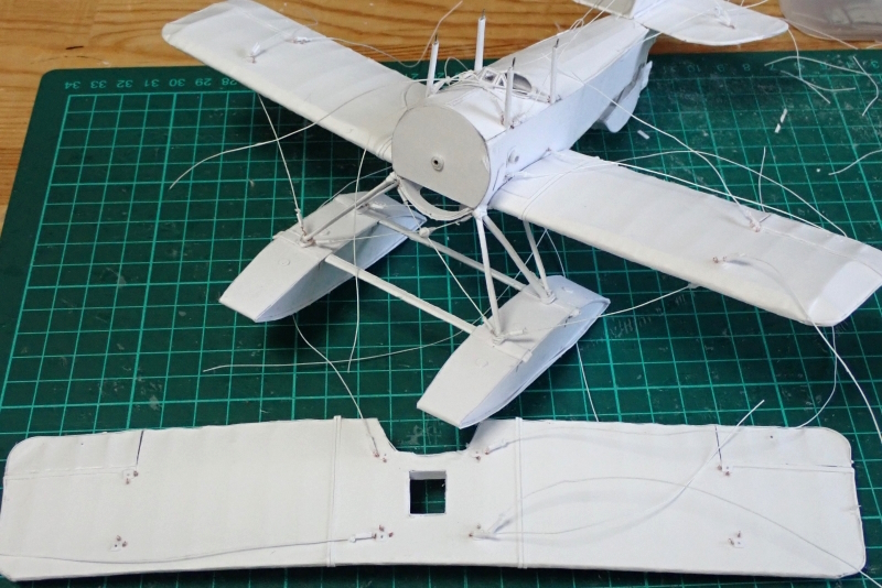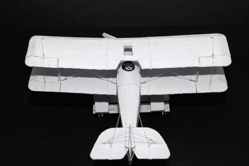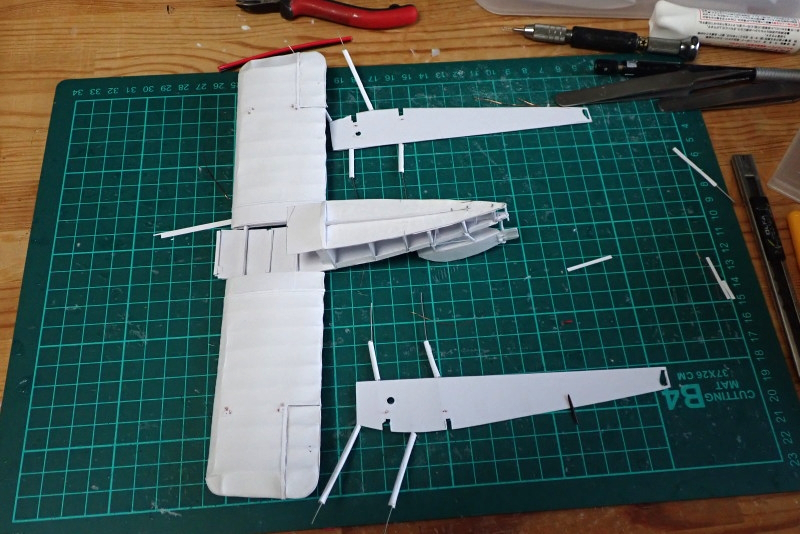紙模型では穴貫通や支柱に縛り付ける方式をとっていたのですが、プラスチックとは異なり取り付け部の強度が不足しがちでした。上翼を乗せる前に始点の張線固定済みのリングを付けることで組み立てが容易になります。