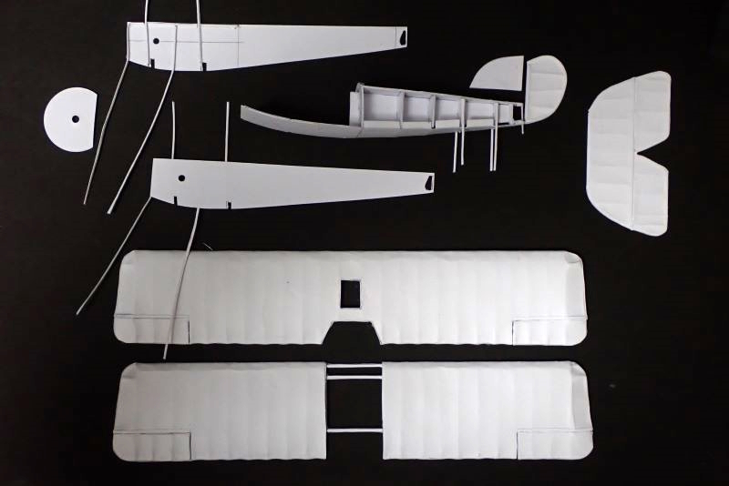 これまでと部品の構成を変えて組み立てやすさを追求しました。下翼を左右一体で作ることで左右のバランスがとりやすく胴体への固定が確実になります。紙巻きしたステンレス針金のフロート支柱や翼支柱を胴体側板に予め取り付けることで組み立て易くなります。
