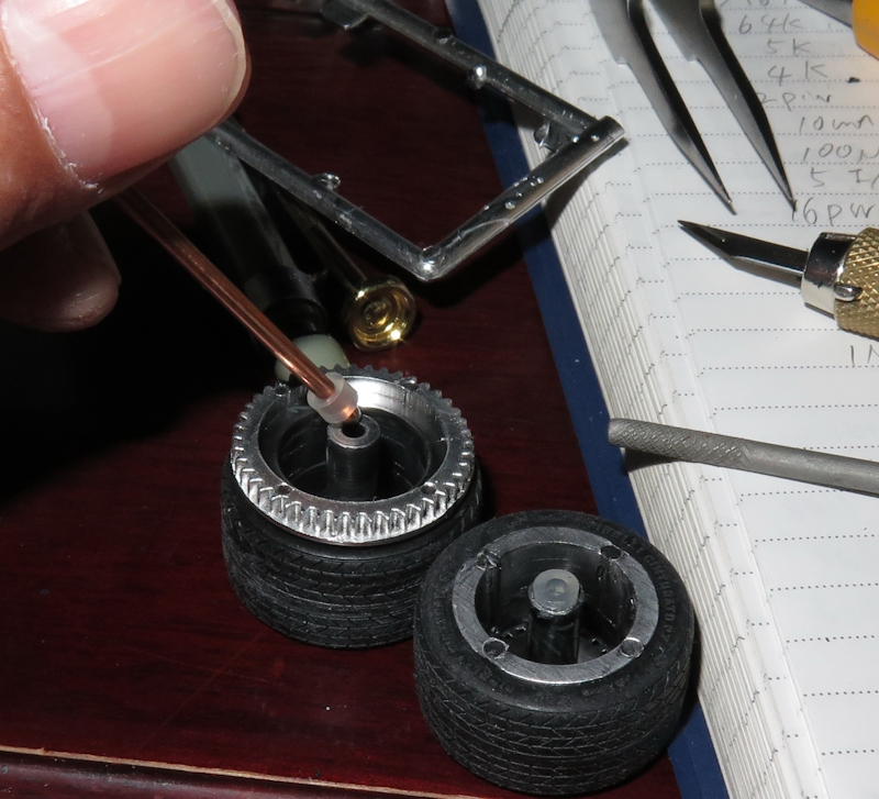 フロントはポリキャップがキツキツながらかろうじて入りましたが、リアホイールは金属シャフトにはブカブカ、ポリキャップには小さすぎてミスマッチ。