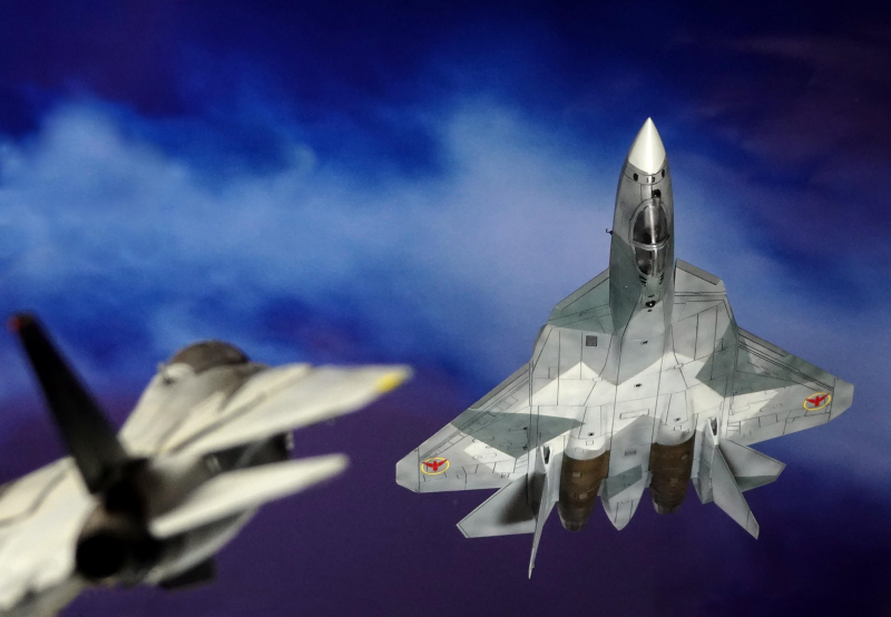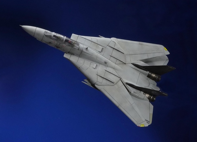 一方、追いかけ回される方のローグネーション『F-14』は、1/144でレベルやトランペッターなどの優秀なキットを作るのに飽きてしまい、今回は初めてドラゴン社製のものに挑戦してみました。この製品はドラゴン社の黎明期のもので、野太いモールドやガタガタのキャノピーなど、今となってはまともに相手にすべきキットではありません。しかしながら、完成した全体形にはいかにもそれらしいアウトラインを見せる点、後に数々の名作を産み出す同社の片鱗をほのかに感じることはできます。また、こちらのマーキングについてもデフモデル社のデカールセットを使用しましたが、いずれもしょせんは「おまけ」なので、詳しい貼付位置などは他の資料を参考にしなければならないことを附記しておきます。