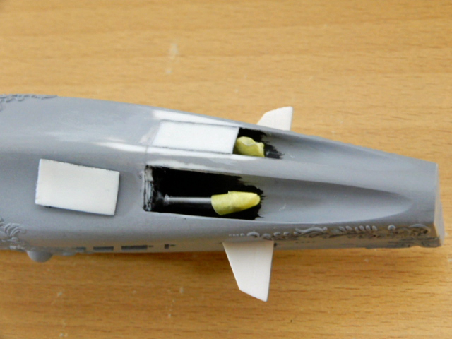 ① 船体後部は,取水口関連の部品を組み込まないと形になりません。また,全体層に備えて取水口周りをマスキングしておかなければいけません。この取水口、スリットがあるのでマスキングが面倒です。