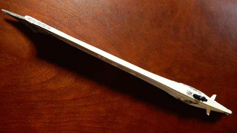 ② 船体前部は,左右の部品を接着するだけ。この前部を後部の受け口に差し込めば,船体がほぼ完成・・・すると思ったら,そうはならないんだなぁ。船体前後の差し込み口の寸法が微妙に合っていないので前部を差し込むと,せっかく接着した後部の左右がぱかっと開いてしまいます。これに対処するために,前後の接合部を削り合わせてやらなければなりません。
