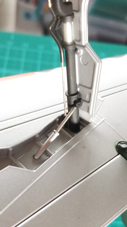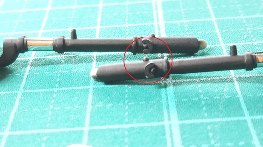前脚の作動用アームの基部側にはピンバイスで二か所穴をあけて