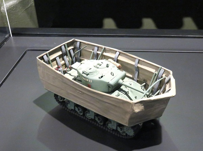 1944年6月6日、連合国軍はノルマンディ海岸に上陸作戦を敢行し、5カ所の上陸地点で、英軍の開発したシャーマンDD戦車がお披露目をしました。DDはDouble Drive(二重走行)の省略で、 シャーマンの車体体に、防水加工した折りたたみ式のキャンパス地のスクリーンとゴムのスカートを巻いて浮力を確保し、エンジンに駆動力抽出装置を取付けて2基のスクリューを回し、時速7kmで航海するという、アイデアに富む特殊戦闘車両でした。なおDDをDuplex Drive とする資料もあります。