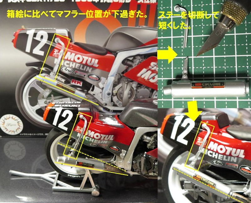 3)マフラー位置が箱絵や実車写真に比べ下に下がり過ぎていたため、リアカウルからのステーを短く切って修正した。