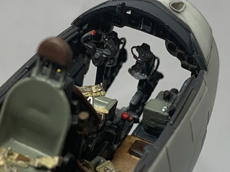 このキット最大の売り(見せ場)はコクピット。1/48並みの精密感に驚きです。シートベルトは付属デカールをエデュアルドのカラーエッチングに置き換え、左サイドパネルの赤や黄のレバー類はエッチングの切れ端と瞬接の盛り付けで再現しました。