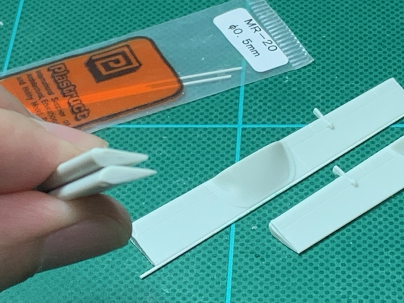 フラップ・エルロン後縁の厚みが実感に欠けるので0.5mmプラ丸棒を接着して上下から削ってエッジ出し。写真上が整形前、下が整形後(違いが判るといいのですが)。写真にはありませんが昇降舵の後縁も同様に整形しました。