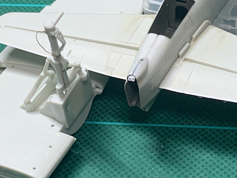 ブレーキパイプを真鍮線で追加し、トルクアームに軽め穴を開口しました。胴体後端の燃料投棄口は内部の排出管を0.8mmプラ角棒2本を開口してそれらしく再現。ちなみにハセガワの1/72はこの排出管をきちんとパーツ化していてさすがだなと思いました。