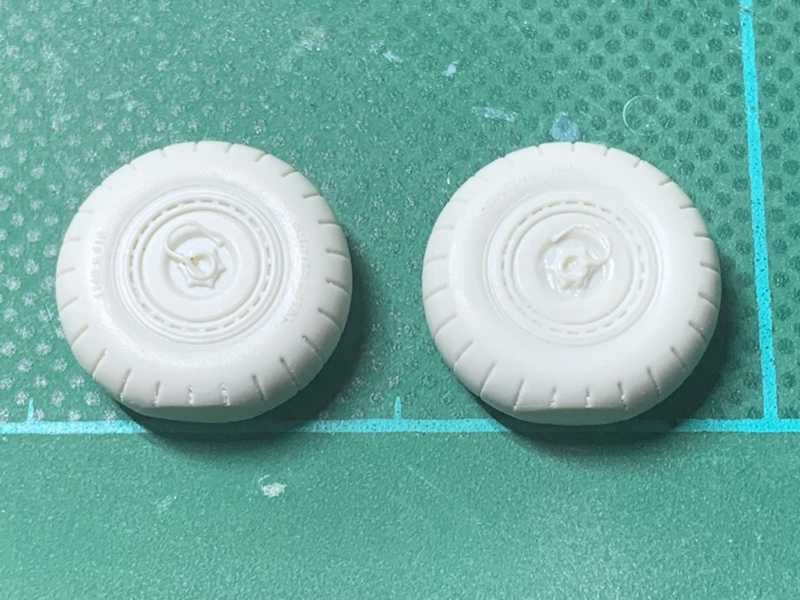 主輪パーツは同じランナーが2枚でブレーキパイプのモールドがいずれも右タイヤ(写真左)なので、一つはモールドを削り落として伸ばしランナーで左タイヤを再現しました(写真右)。