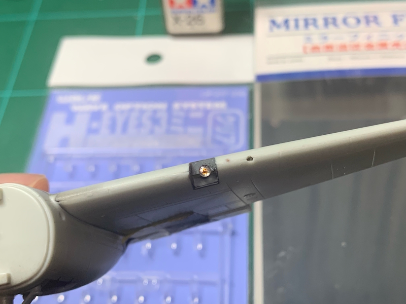着陸灯はカバーのみでレンズがなかったので、ウェーブのHアイズ3ミニ2.2mmを使用。中心に裏から凹みを彫ってクリアーオレンジを垂らし、ハセガワのミラーフィニッシュを貼りました。こういうチマチマした作業が楽しいんですよね(笑)。