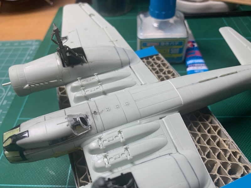 全体としては合いの良いキットですが、それでも各所に隙間が生じますので、溶きパテやタミヤ瞬接イージーサンディングで埋めています。特に胴体下部中央の隙間は大きく、ここだけはプラバンを挟みました。