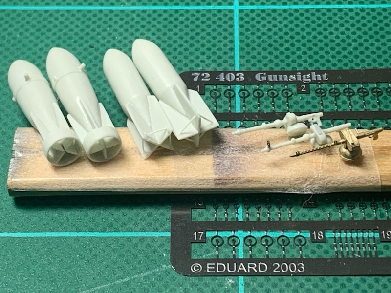 爆弾はフィンや円板を薄くし、支柱は0.3mmプラ丸棒に置き換えました。MG15機銃は引き金の開口、弾倉ストラップの再現、エデュアルドの照星を追加しました。前方機銃は製作中に破損してしまい、手元にあったミニワールドのメタルパーツを代用しましたが、このあと更なる悲劇が...