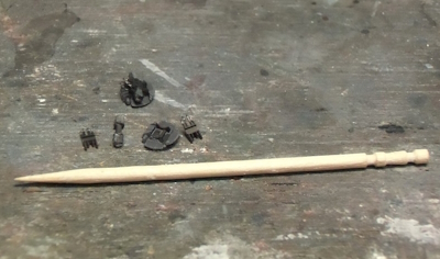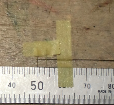 (写真8) マストの先端部分のみ真ちゅう線に変えます。これはハンダ付け様に養生している場面ですな。実はココに付くのは、対空警戒用八木アンテナ4×2セットなんだけど気にしない。どーせパーペキには再現出来ないし誰も気付かないよ。見えないパーツは無いパーツ、ってコトで。