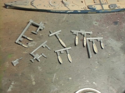 (写真11) ボートや内火艇をチマチマと塗って行きましょうかね。ランナーからは完全に切り離さないのがミソ。
