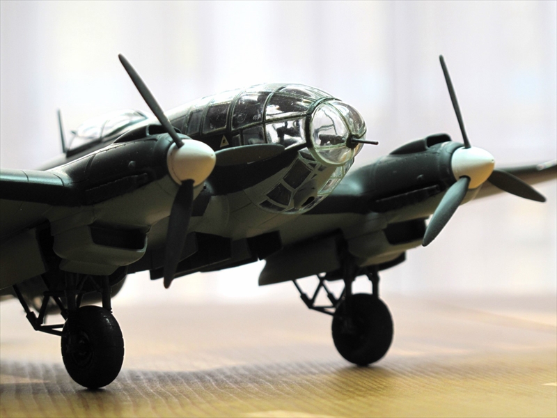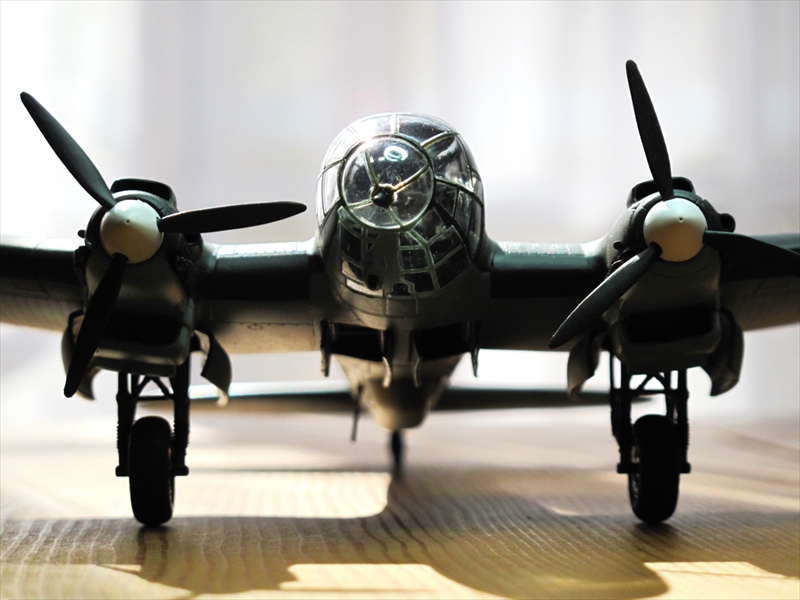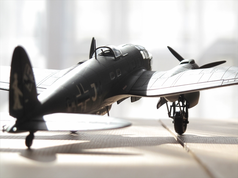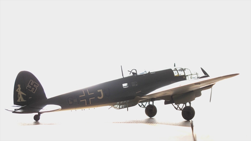 He 111はドイツに緒戦の勝利をもたらした優秀な機材でしたが、後上方の防御に旋回機銃一挺 というのは(他のドイツの爆撃機も同様)防御力をマジメに検討していないと言わざるを得ません。He 111の脆弱性がバトルオブブリテンにおけるドイツ敗北の一因でもあり、その後の戦局に重大な影響を与えたと思います。この角度から見ると美しいんですけど、、、。