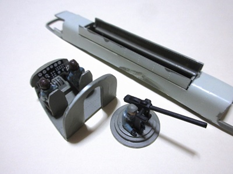 キットの特徴であるゴンドラと乗員とその環境を作るのは愉しかったです。機長、副操縦士、砲塔射手の3人というのも、強い馴染みがあり感情失禁ものです、3人は「爆撃命令」のギャラガー大佐、ストーバル少佐、コマンスキー軍曹ですが。
