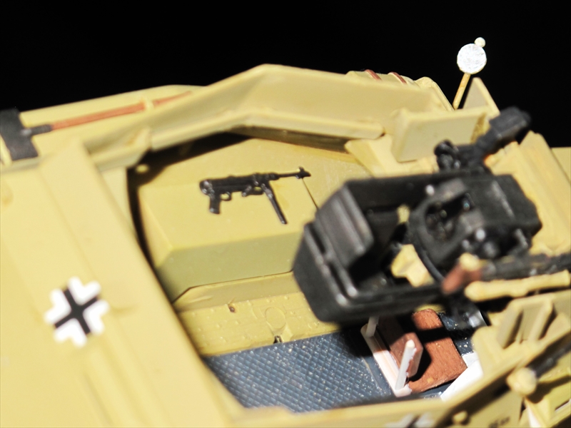 また車内には護身用として短機関銃MP-40が装備されています。敵の歩兵に襲撃されたら これで応戦する、そんな状況は想像するのもイヤですが、、、。