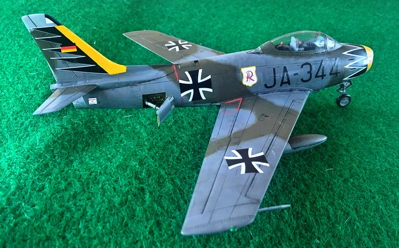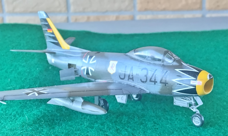 最後に墨入れブラックでウォシングしてデカールを張り込みます。デカールは色透けもなく良いものでした。機首の黒いチューリップ部分は三分割にして貼り込みました。最後に脚関係とドロップタンクを接着したらこれにて完成です。西ドイツ空軍のなかなか精悍な姿が再現された良いキットでした。ではまた。