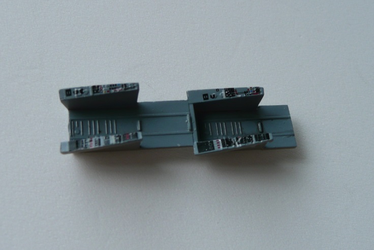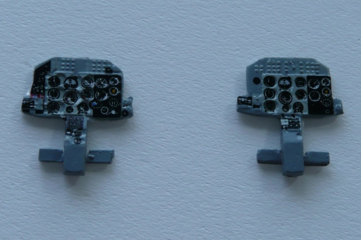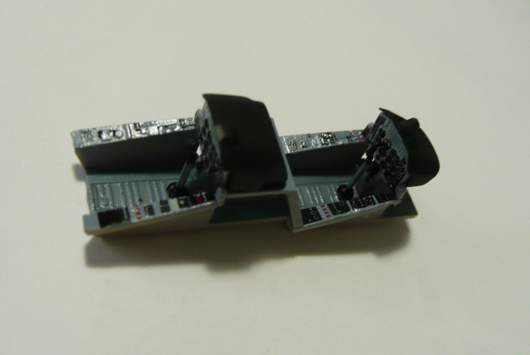 まずはコクピットから始めます。コクピットは床サイドコンソール前後席分がモールドされたものと、前後席の計器盤から成ります。キットはウィークエンドバージョンのため計器盤、サイドコンソールともデカール仕上げです。それでもパーツには計器のモールドが施されているため、デカールを軟化剤で馴染ませて貼り付けました。(写真1)がサイドコンソールの付いたコクピット床部。(写真2)が前後席の計器盤です。左が前席用です。ペダルは別部品で塗装前に計器盤の支柱に接着しています。