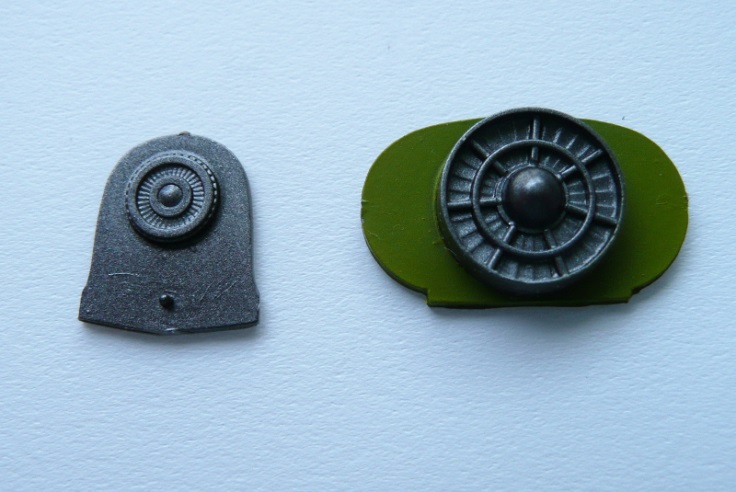 胴体は左右二つ割りで、コクピット内側には内装のモールドが施されています。コクピット内はライトガルグレイですが内装部分とエアーインテイク内面は、インストの指示通りダークイエローに塗装しました。(写真4)さらに胴体中央部にはエンジンの圧縮機フロントファンを、排気口手前には最終段のタービンファンを取り付けます。それらが(写真5)で左が隔壁にモールドされたタービンファン、右が圧縮機ファンです。
