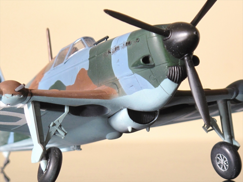 完成させてみると、いかにも近代化途上の戦闘機の趣です。下部に「ハ」の字に開いた主脚はタイヤが曲がっていると言われそうです。照準器は眼鏡式、小口径機銃にしては主翼の大きな膨らみ、尾輪ではなく尾橇、などが目につきます。このキットとしてのもう一つの大きな欠点は プロペラが前から見て反時計周りになっていることです(実機は時計周り)。新たに対称形のブレードを3枚作って元のスピナーに正しく埋め込むという作業は小生にとって難しいのでそのままにしています。