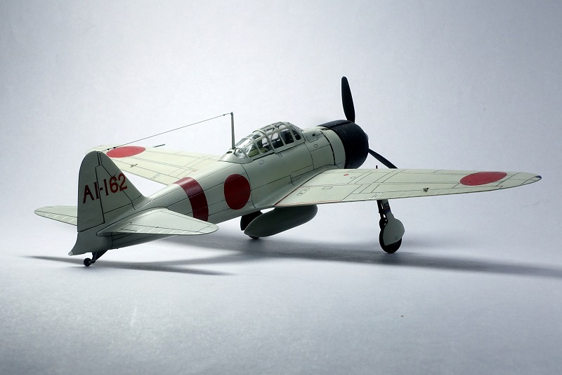 なにはなくとも『赤城』一航戦、私の考える最も美しい零戦です。とは申しながら、赤帯が胴体を一周していたかどうか、いまだに定説はないようで、劇中でもモックアップは下部切れ、CGは全周となっており、今回はタミヤのインストラクションに従い下部切れで塗装いたしました。製作したエアフィックスの新しいキットはこの二一型のフォルムとしては機首がやや短く、ちんちくりんな子犬のようにも見えます。またパーツ類は肉厚で取り扱いは容易ながら、その分、多少大味で、さらに例によってスジボリが深目で、1/72大戦機の表現としてはいささかオーバーです。