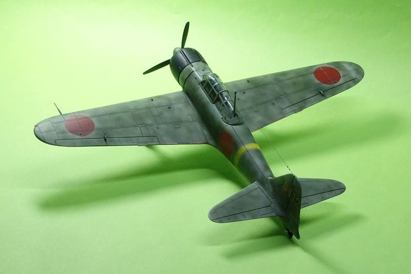 映画の登場順ということで、時代は少し遡って「後期ラバウル航空隊」で武闘派の上飛曹と模擬空戦を行なう機体ですが、ラバウルも後半戦となると現地塗装の荒っぽさが目立つようになってまいります。なお、今回は手持ちの都合でキットに<ハセガワ 1/72 零戦一一型>を使用しましたが、これをそのまま一一型として製作する場合、これが仮に45番機以降の機体をモデル化したものであったとしても、着艦フック孔を塞ぐパーツはおろか、その指示すらなく、ただ箱絵と組立説明図の表紙を変えて、二一型のパーツに一一型のデカールを付けただけの「なんちゃって一一型キット」である点には留意が必要です。