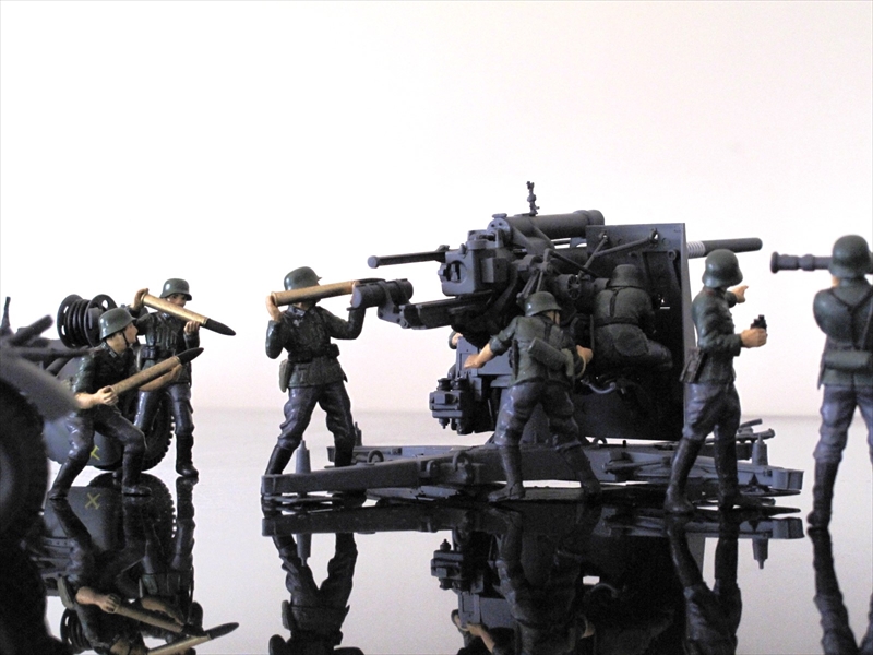 タミヤのFlak36は初出が1972年10月、Sd.Kfz.7は1970年代に模型店で見かけた覚えがありますがMMシリーズとしては1990年12月の登場です。いずれにしてもベテランキットです。小生のは10年ほど前に製作したものです。プラモキットとして特に画期的であったのはFlak36で実物の調査情報はもちろんの事、砲の射撃チーム8名+伝令兵1名のリアルなフィギュアとFlak36の簡単な戦記の解説が付属していたことです。