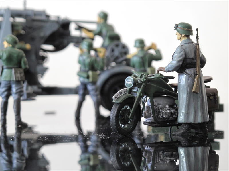 砲撃の様子を見つめる伝令兵です。キットの組み立て説明書では付属のツェンダップオートバイを最初に組み立てるように書いてあります。モデラ―が部品数の多さ(約200パーツ)に怖気つかないようにとの配慮でしょうか。