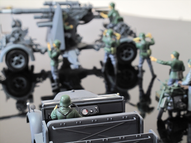 Flak36の牽引は砲口を前にして行い、目的地に到着すると牽引を解除して牽引車は一旦前方に進み、方向転換して後ろへ下がりますます。この方法ですばやく射撃位置での準備が行えるということです。Sd.Kfz.7の幌は途中からはずしました。