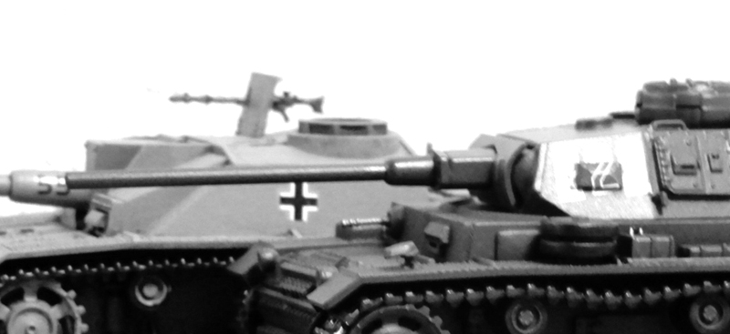 2輌のそろい踏みです。Ⅲ号戦車は,汚しなし。Ⅲ号突撃砲は,影色の地に平筆でタークイエローの重ね塗りです。