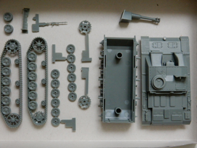 スライド金型の恩恵を受けてはじめから砲口があいております。キャタピラの組み込みは,車体との干渉があって結構面倒でした。
