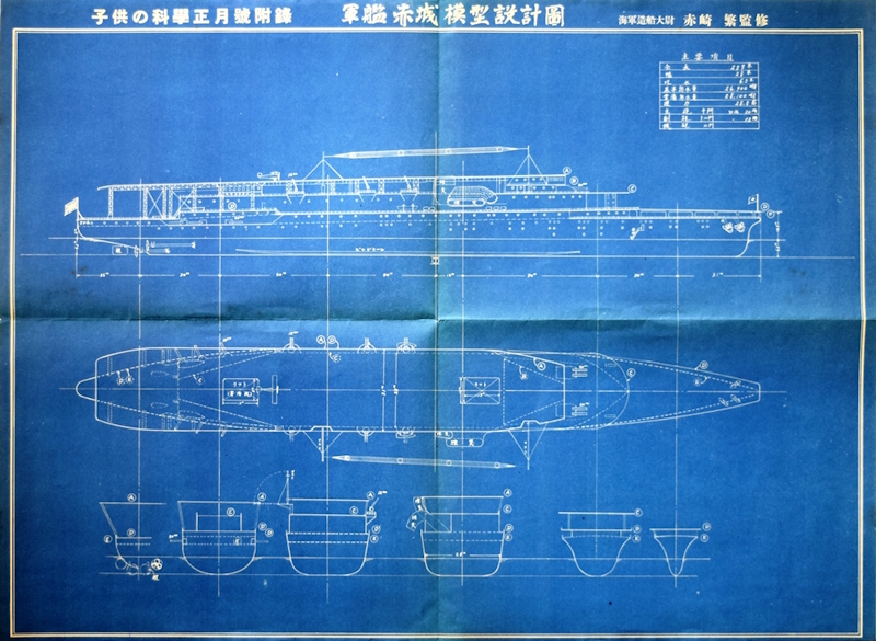 青図のような印刷物は、『子供の科学』昭和6年新年号の付録。今から90年以上前のもので、A2版くらいの大きさ。「海軍造船大尉 赤崎 繁監修」とある。反対面には赤城の写真が刷ってある。前方昇降機の位置や飛行甲板の形は実艦とやや相違していて正確な図面とはいえないまでも子供の本の付録だと思えば立派なもので、前方が上がった上段飛行甲板、逆に前下がりの下段飛行甲板もしっかりと描かれている。解説に「出発甲板Cまたは帰着甲板Aから出発した飛行機は任務を終へ再び帰着甲板A上に到着し」とあり、「艦橋はB甲板の前端にあります」として中段を艦橋用みたいに説明している。